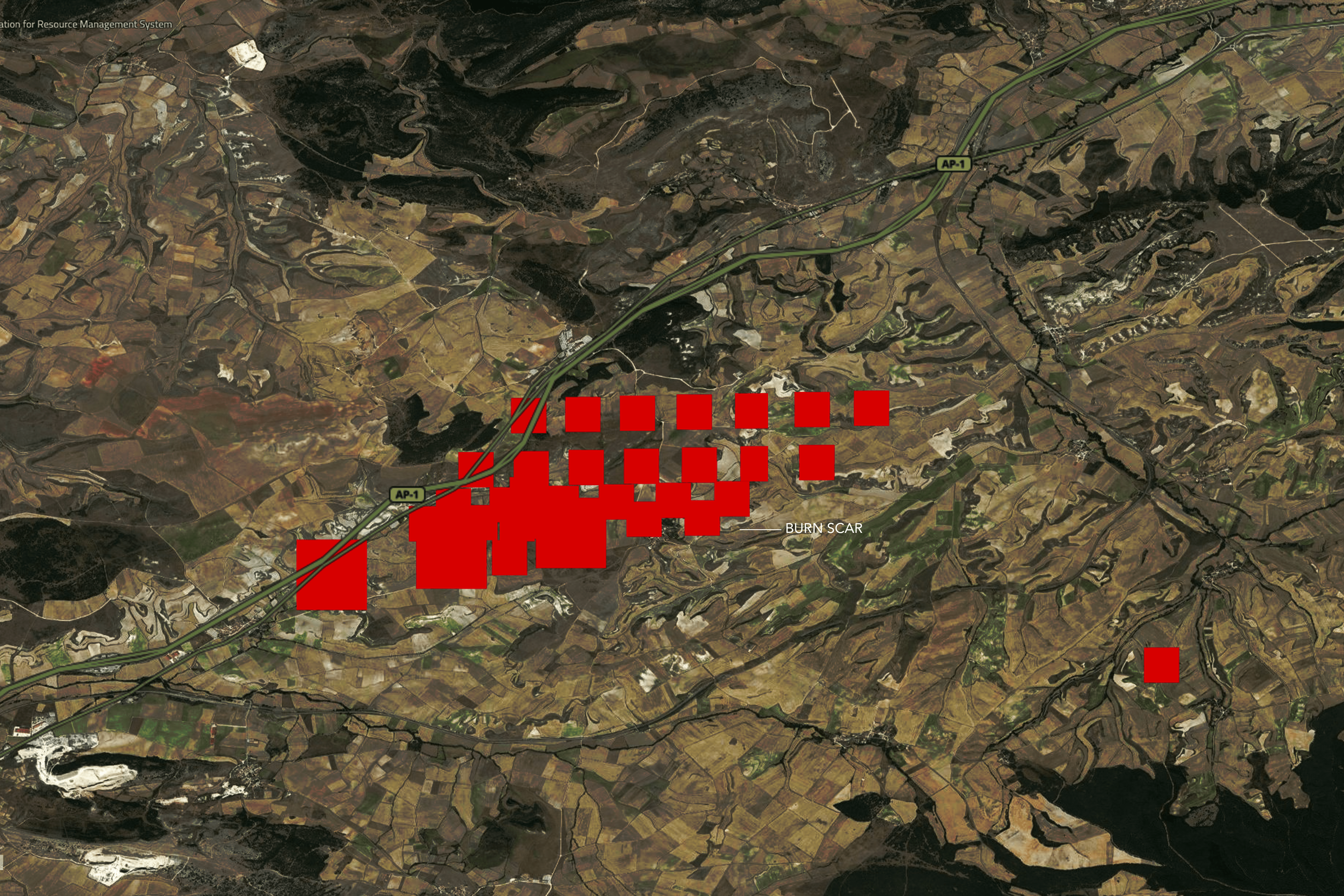 En agosto de 2012, un gran incendio quemó más de 200 hectáreas en Fresno de Rodilla. Land Life llegó en 2018 para empezar a restaurar la zona y el pueblo vecino de Quintanapalla. Fuente de la imagen: NASA.